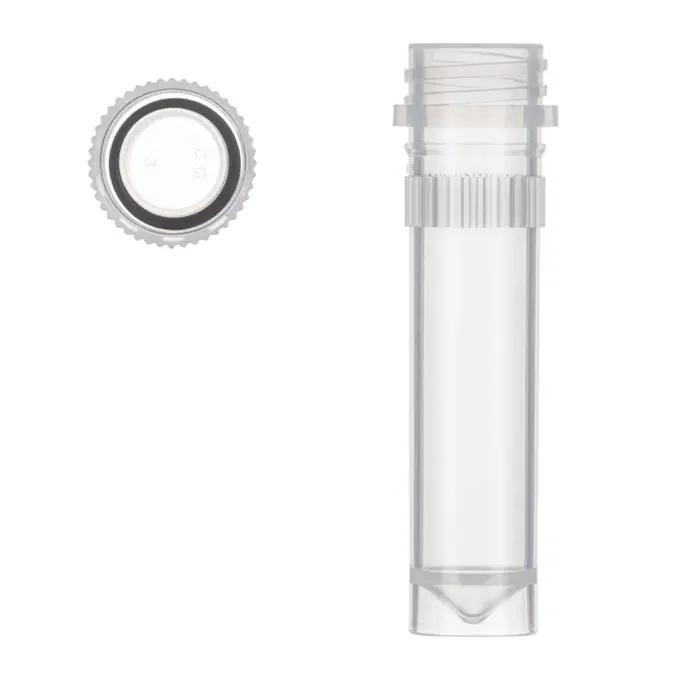 2 mL microtubes with separate caps and silicone O-rings for airtight sealing. Natural finish, DNase & RNase-free, sterile ideal for cryogenic and molecular biology applications.